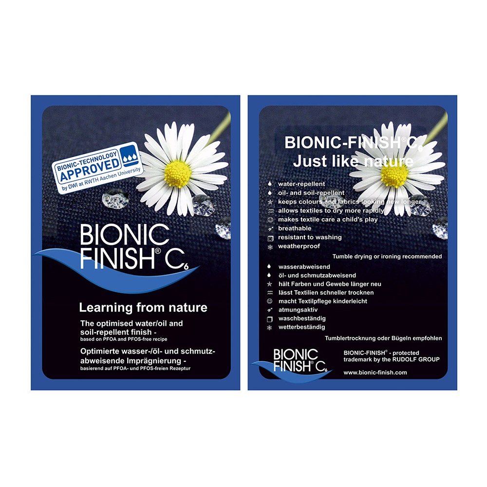 SILVERPLUS® evita la proliferación de bacterias, mientras que BIONIC FINISH® C6 consigue que el agua, líquidos grasos y suciedad se deslicen sobre el tejido.